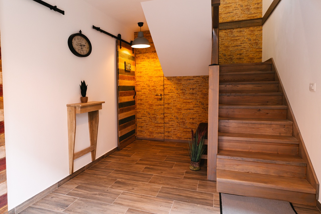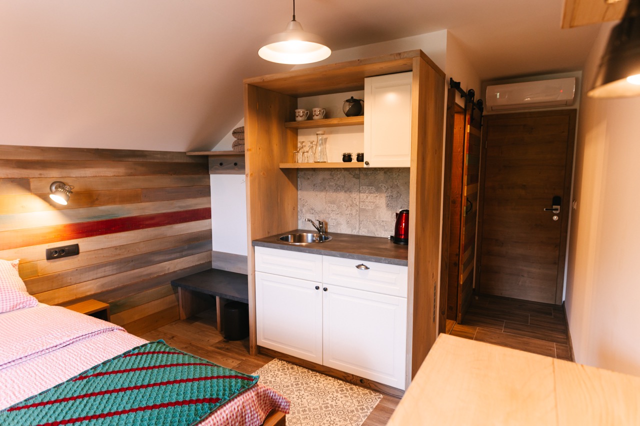 Trije novi studiji v sosednji hiši so opremljeni v rustikalnem slogu z unikatnim, ročno izdelanim pohištvom.